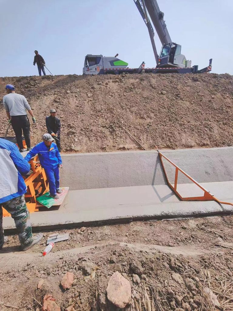 看下這個現(xiàn)場,高速公路的排水溝在公路的坡下,這就造成了增大上料花費的問題,因為坡度大,垂直高度也大。只能選擇采用吊車上料。普通的情況下如果和道路挨著,罐車是可以往機器里面卸料的。而如今這個現(xiàn)場,只能通過罐車放料到漏斗里面,吊車吊著漏斗去給機器上料。雖然有點耽誤時間,但是總體算下,使用機械施工的速度還是人工施工的好幾倍。
